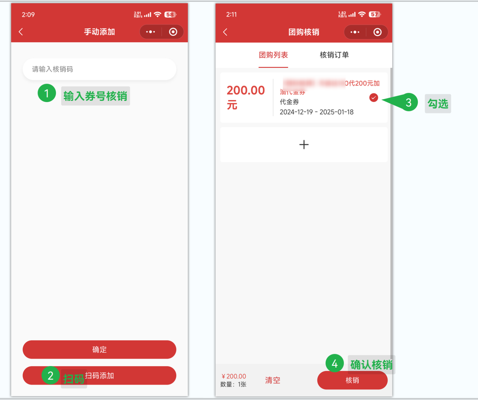 3)核销抖音券可选择输入核销码或扫码添加两种方式选择需要核销的抖音券,点击【核销】按钮即可完成核销。