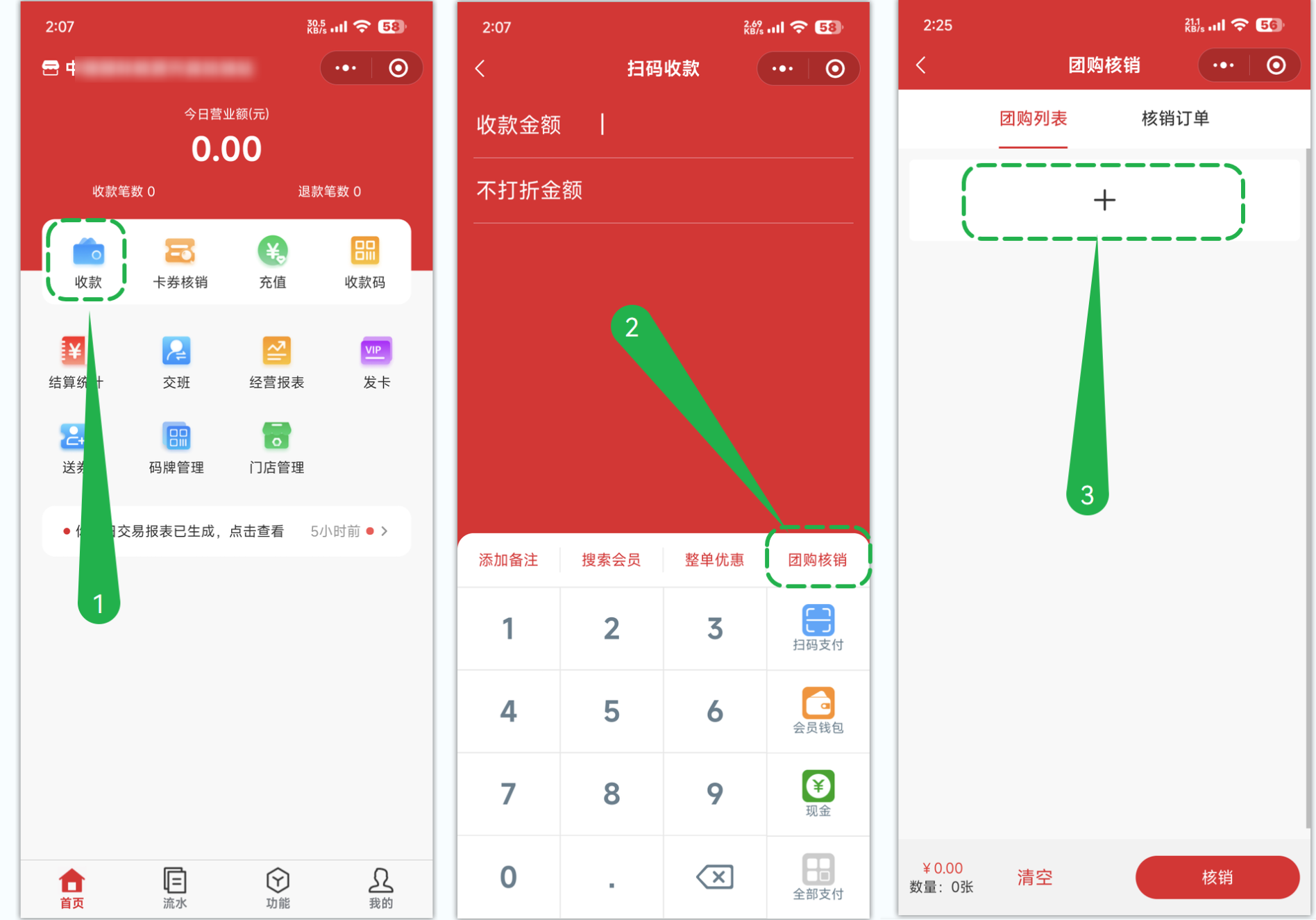 2)在收款页面,点击【团购核销】入口,点+号进入操作页面。