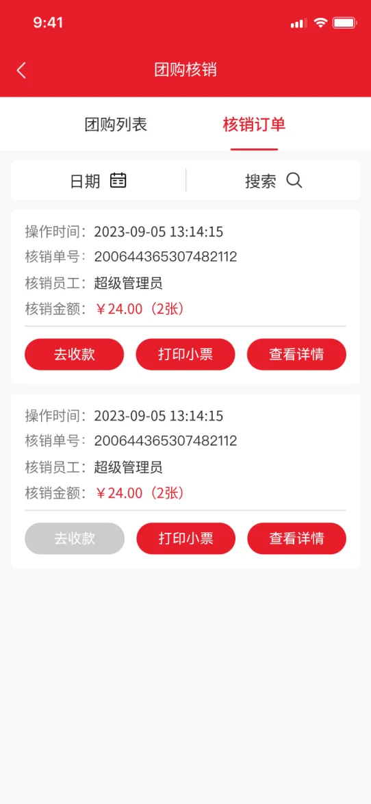4)核销成功后,系统会跳转至核销订单列表页面,可查询记录和打印小票等。
