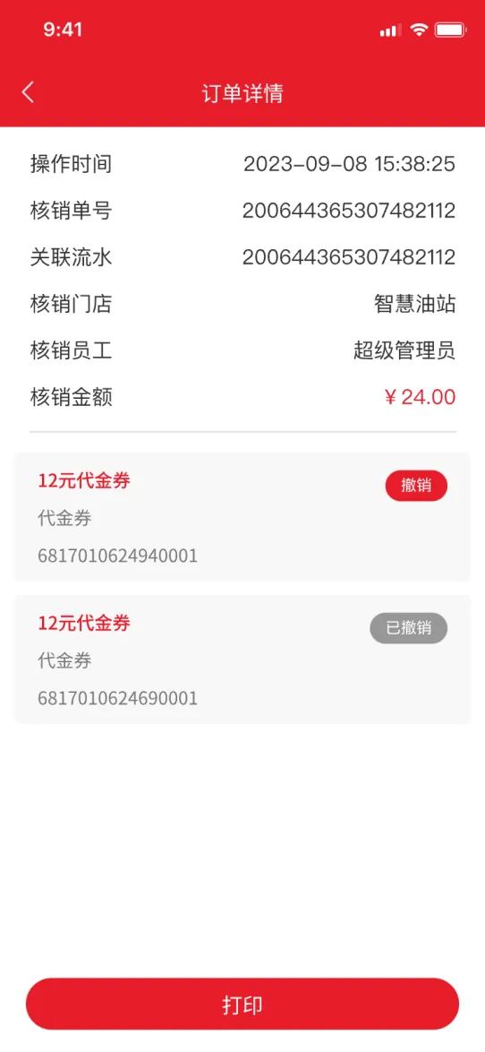 5)核销订单详情可查看核销的优惠券明细,可进行【撤销核销】操作。注:撤销核销仅能在核销后一个小时内进行操作。