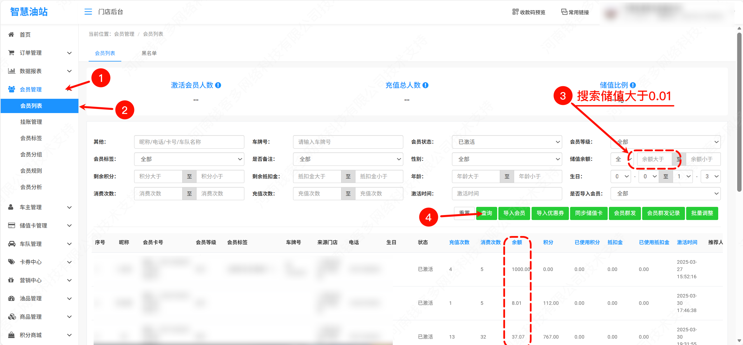 查询总剩余储值、积分,每个会员剩余储值