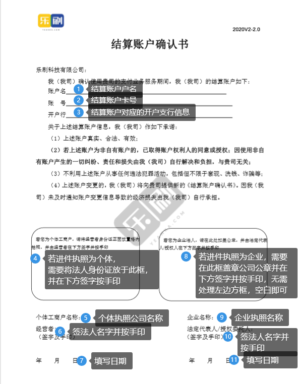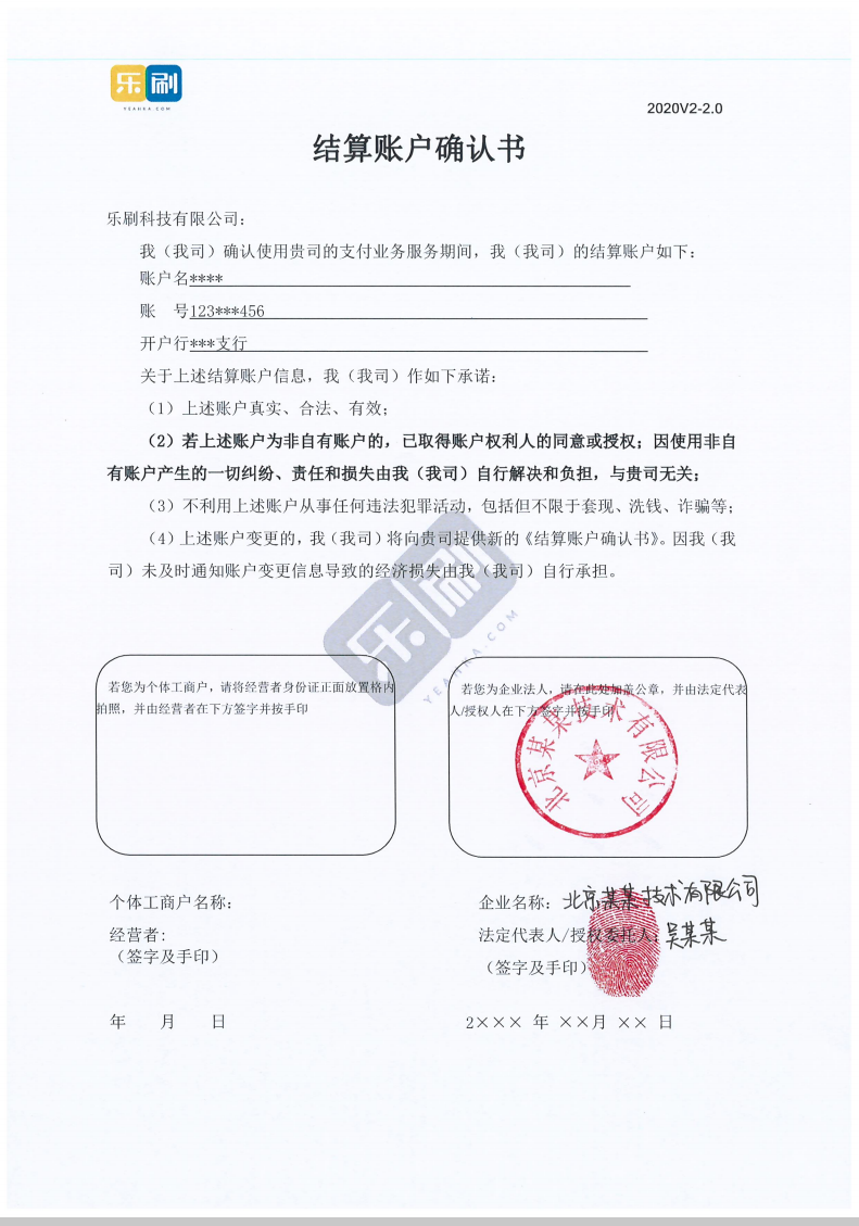 乐刷非法人授权的结算账户确认书填写标准