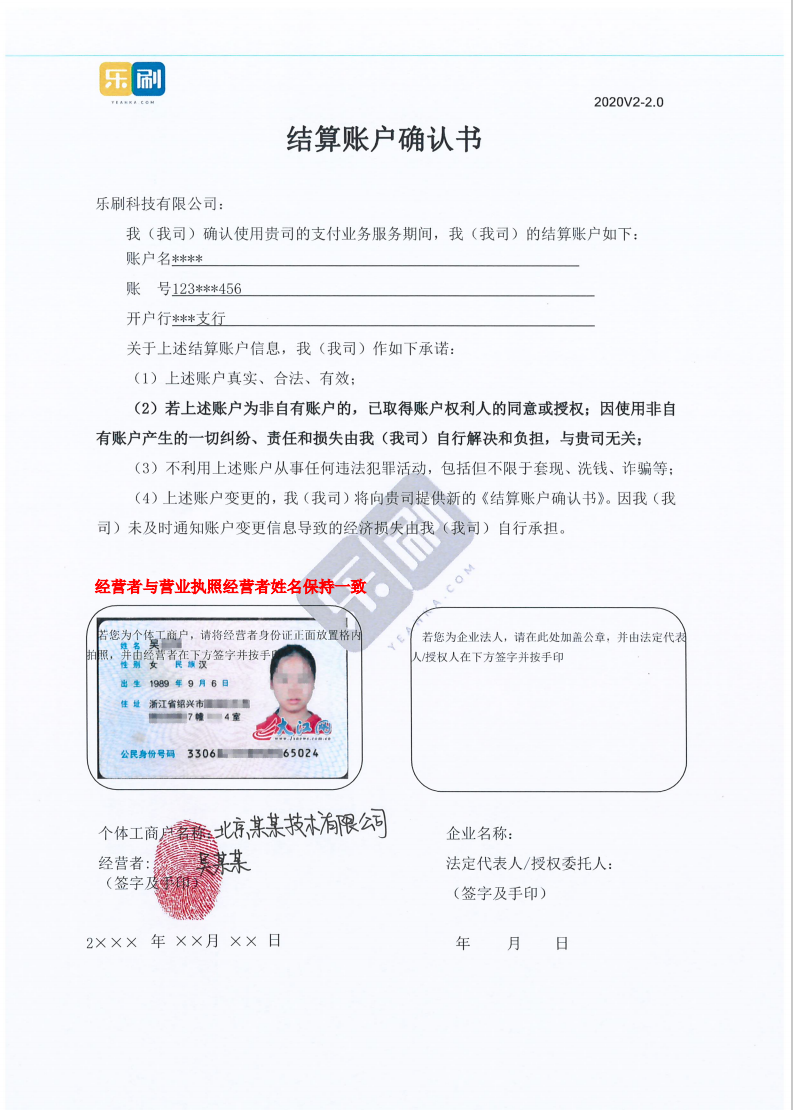 2、如商户使用的是个体营业执照,确认书上方正文填好结算账户信息,左边方框放上营业执照上对应的法人身份证,并在下方签署法人姓名、公司名称、日期并按手印。右边方框无需处理,空白即可。