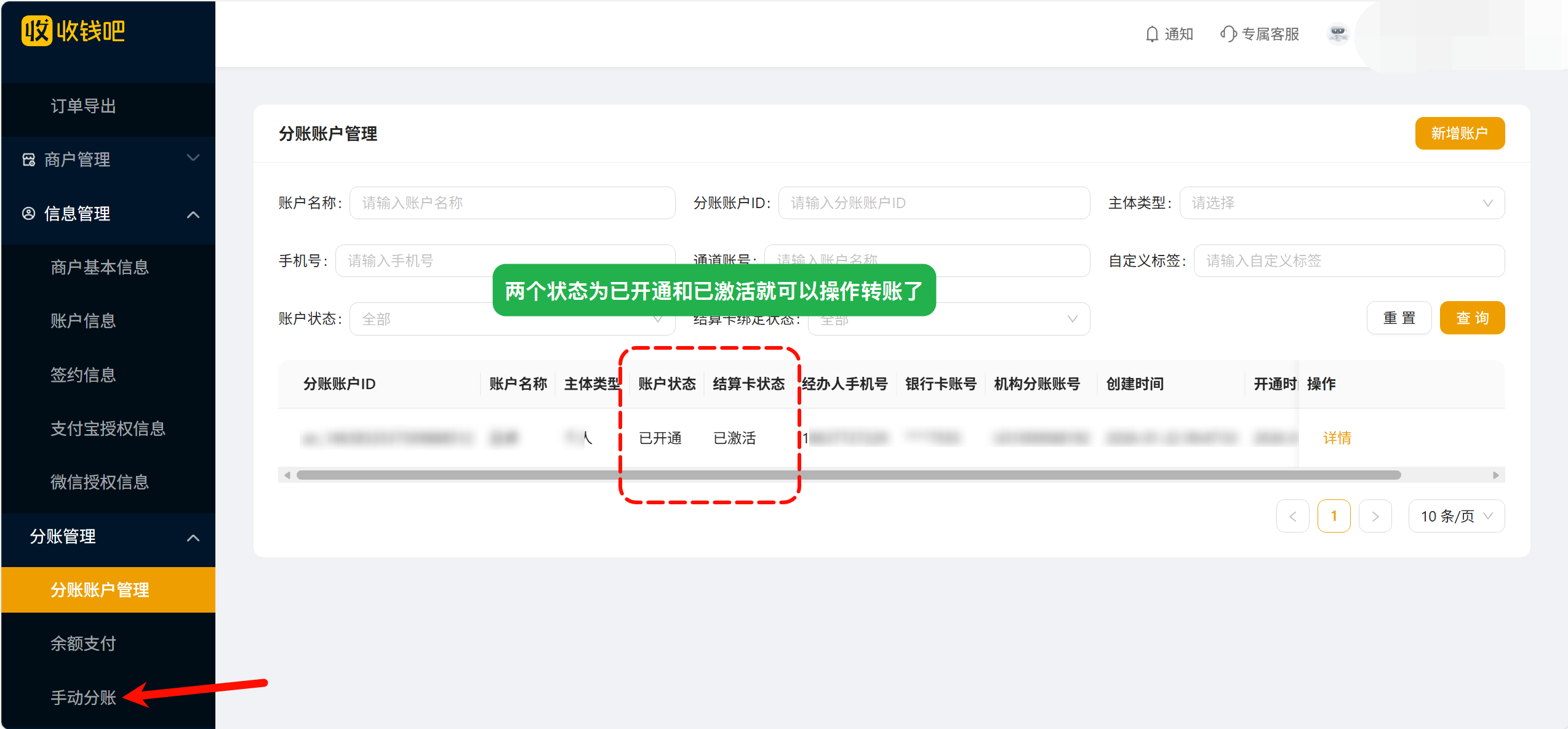 3、签约成功10分钟左右账户状态已开通、结算卡状态已激活就可以操作手动分账