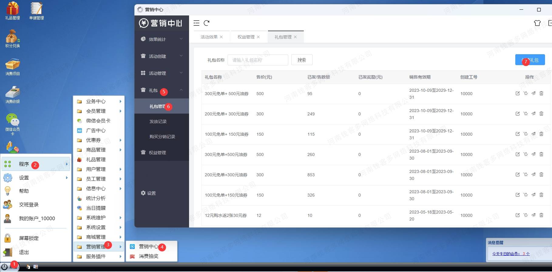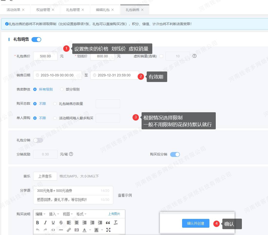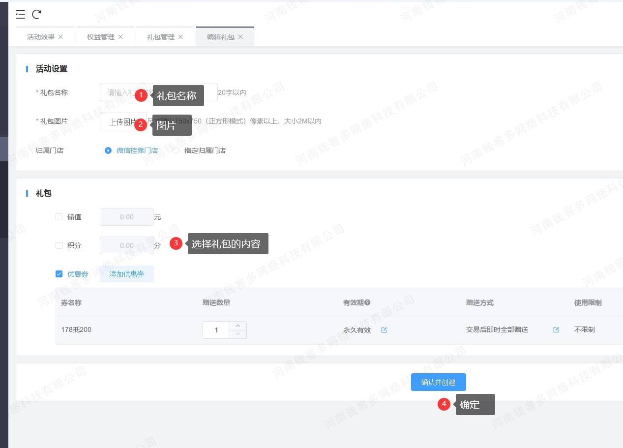2、创建礼包:打开营销中心,填写相关的礼包信息,储值或积分或优惠券或计次,点击 “确认并创建” 即可保存成功。