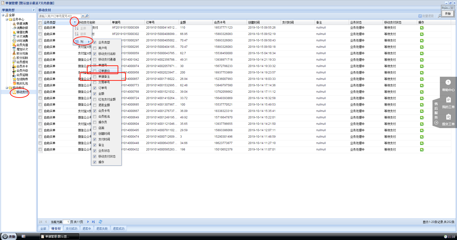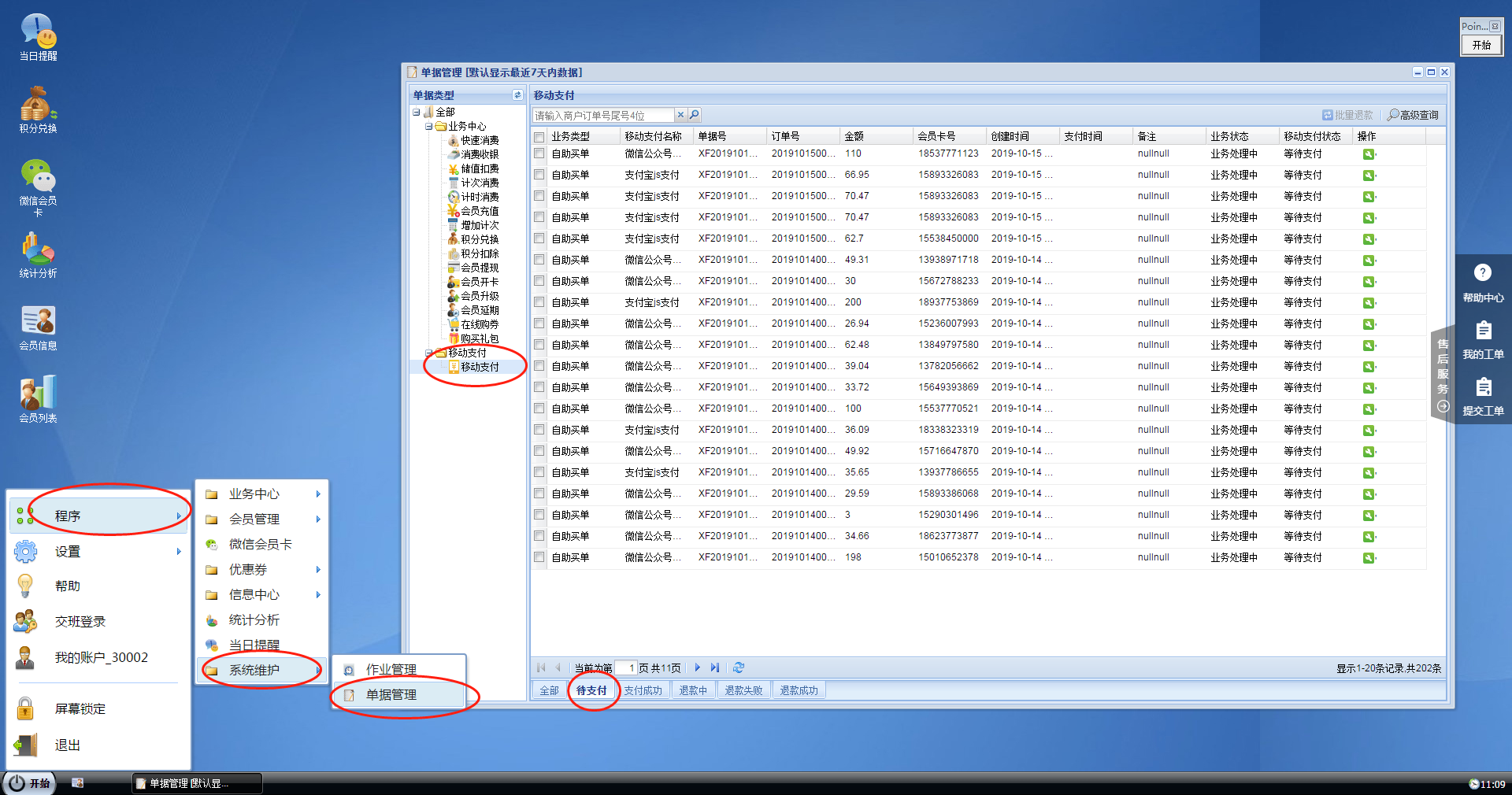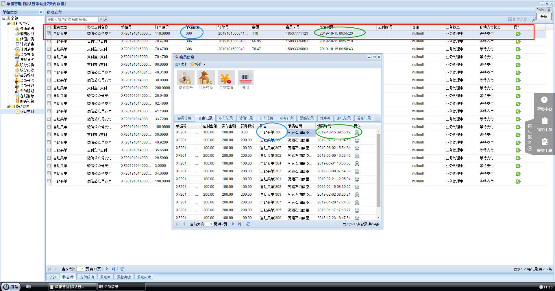 复制单据中的会员卡号,到会员信息查询此会员最近一笔消费记录是否是此员工的单据。如图所示这笔单据的原因可能是会员应该支付100元,顾客支付成110元发现金额错误,重新支付100元三.这么多待支付订单