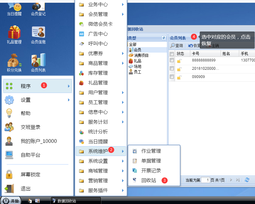 会员列表、消费项目列表、员工列表等删除后会显示在回收站里面,回收站的数据可以恢复,避免操作员误操作,如果确定是不需要的数据,可以在回收站彻底删除。
