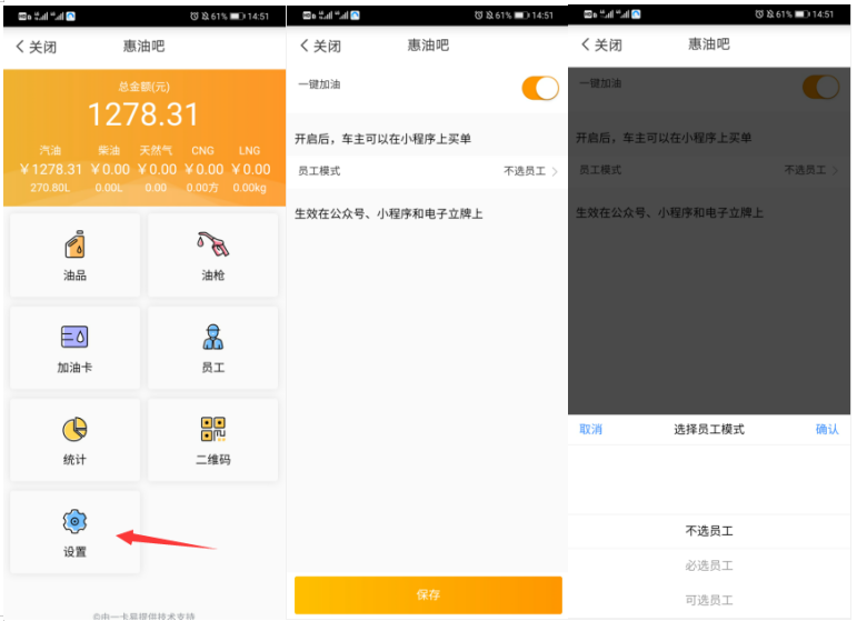 惠油吧->设置->员工模式,可以设置不选员工、可选员工、必选员工3种模式,员工模式设置目前只对微信端惠油吧买单、微信小程序买单、电子立牌QD21加油买单生效。