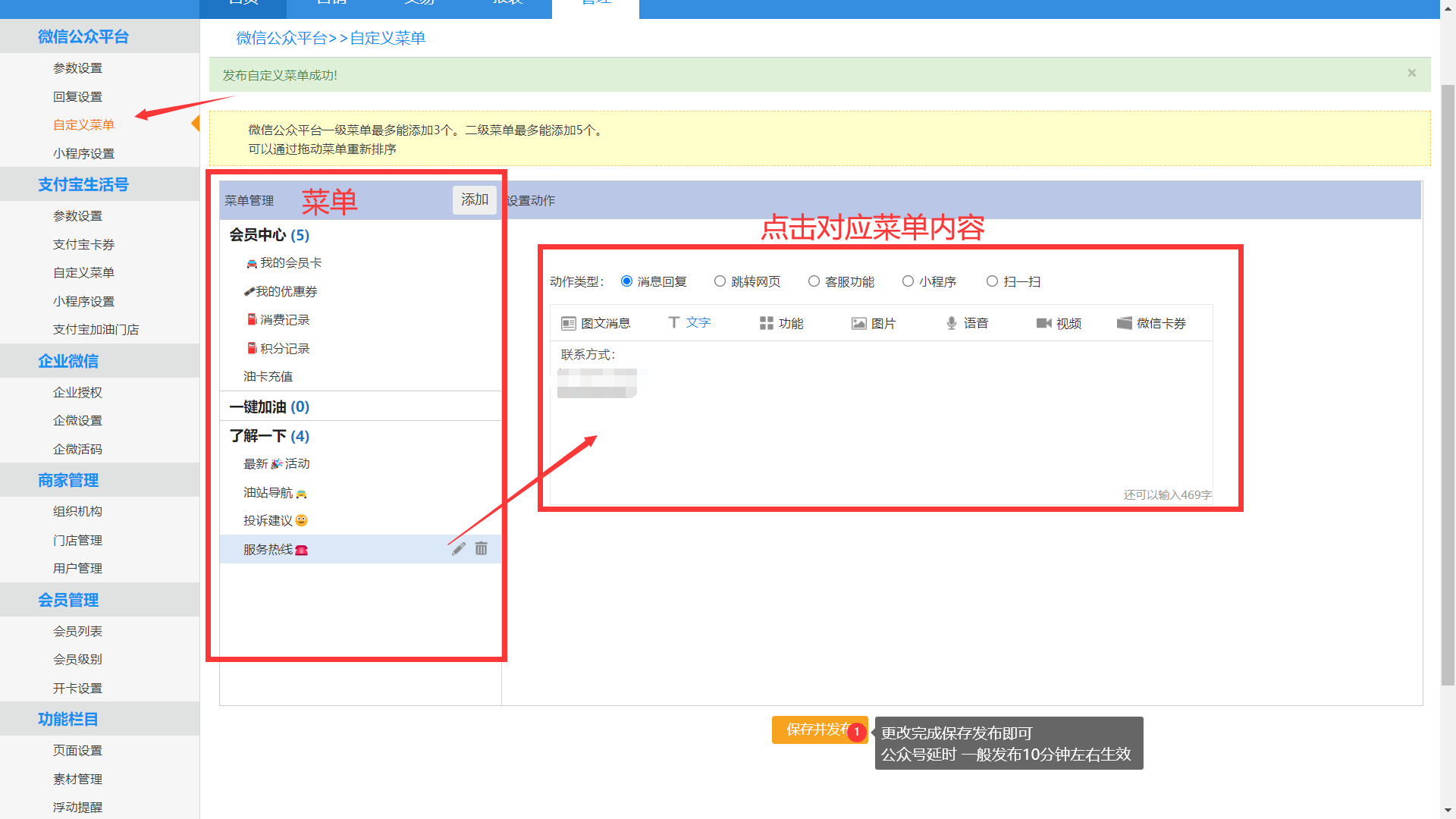 温馨提示:编辑中的菜单不会马上被用户看到,点击发布后会在24小时内在手机端同步显示,粉丝不会收到更新提示,若多次编辑,以最后一次保存为准。