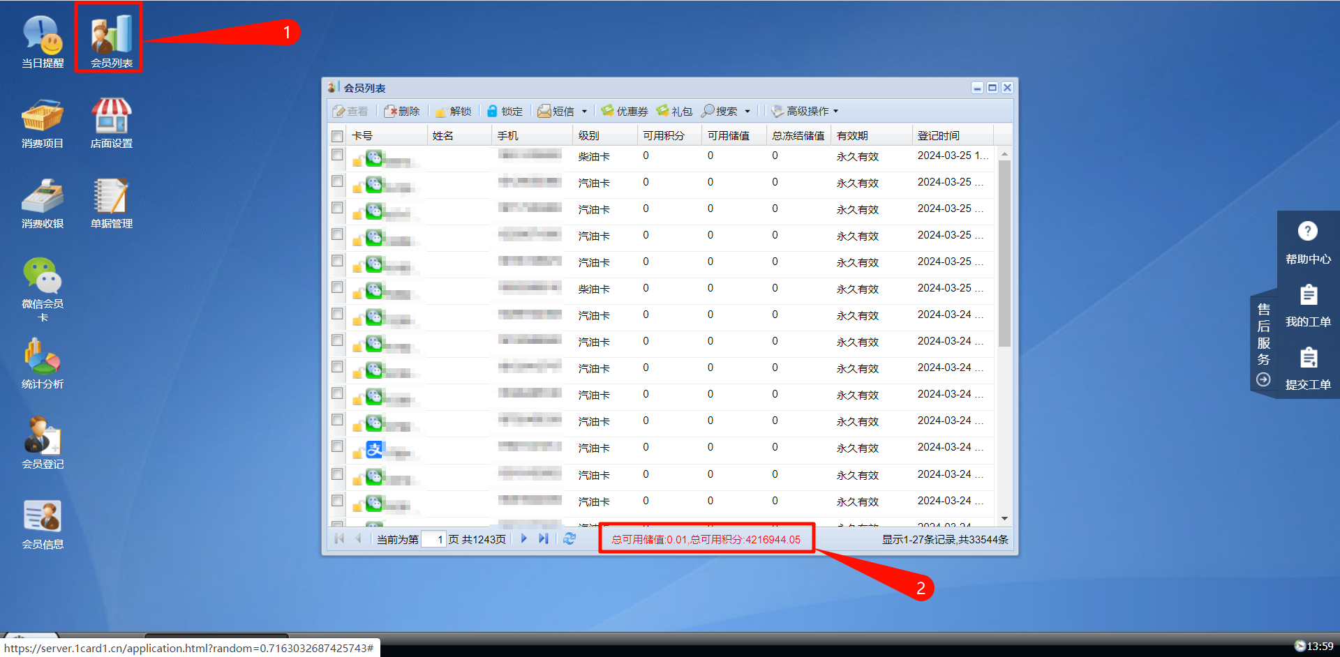 会员列表可以看到每个会员的可用储值和积分,在页面最下方可以看到所有会员的可用储值和积分