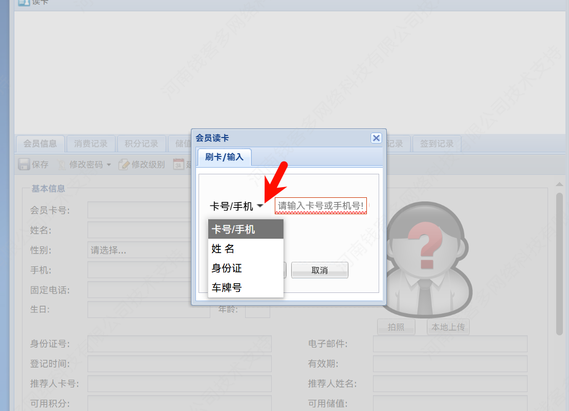 一般情况我们根据卡号手机号读卡,如果你录入的有其他会员信息可以切换读卡方式